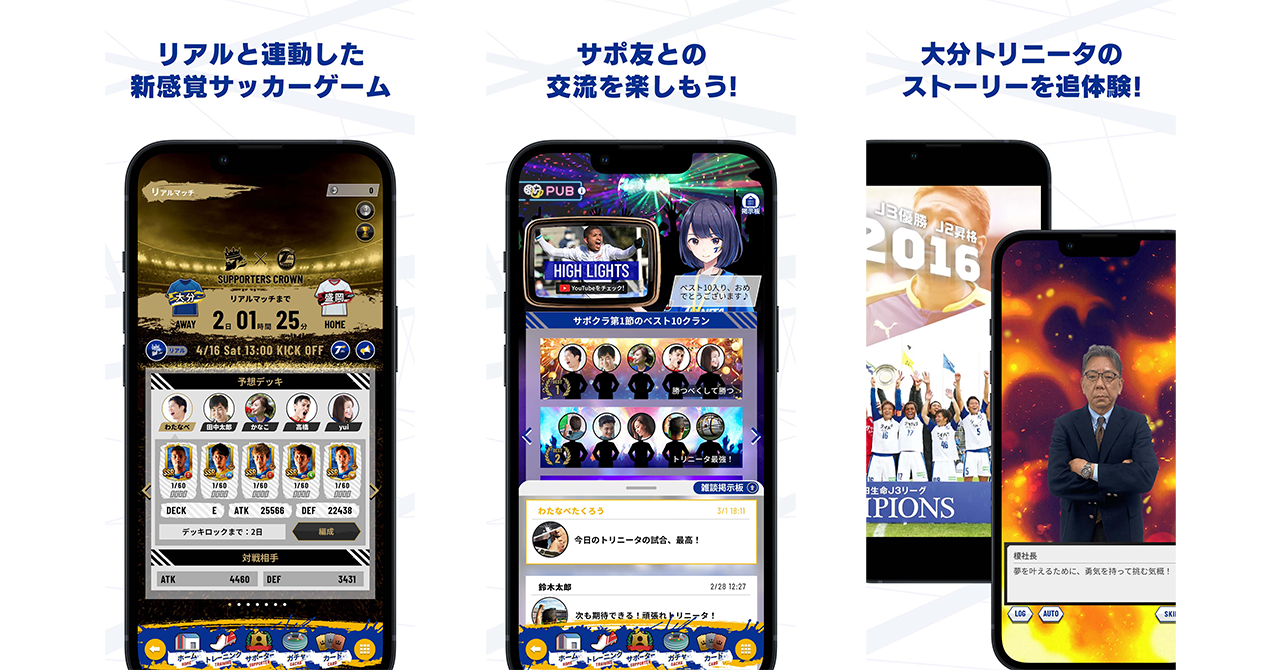 その第2弾となる「大分トリニータ公式サポーターズクラウン」は、トリサポ仲間が毎日集まる場をゲームというカタチで提供しています。大分在住の方はもちろん、都心などにお住まいのトリサポの方にも楽しめる要素をたくさん盛り込んでいます。例えば、毎日開催の試合スタッツ連動ゲームやクランランキングなどはグループ同士で競い合うので、別々に暮らす家族や兄弟、学生時代の友人、遠く離れたトリサポ仲間など、気の合う仲間と一緒に楽しむことができます。