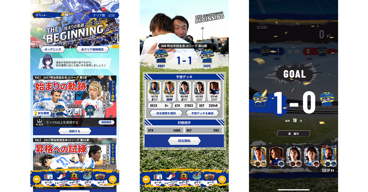 大分トリニータの2017-2021シーズンの軌跡を辿る、ザ・ビギニング<始まりの軌跡2017-2021>イベントが開催されます。スタッツ連動ゲームをプレイしながらJ1昇格や片野坂監督サッカーの集大成を振り返ることができます。さらに全ミッションをクリアするとSSR確定チケットもプレゼント!