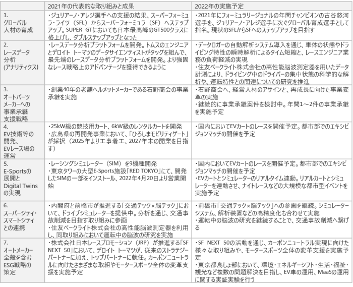初年度となった2021年は、協業の取り組みにより、日本のレースに初参戦したジュリアーノ・アレジ選手のステップアップ、レースデータ分析プラットフォームの開発や老舗ヘルメットメーカーの事業承継支援、内閣府と前橋市が推進する「交通テック×脳テック」への参画など、各分野で具体的な成果に繋がりました。両社は2022年においても、さらなるアナリティクスの向上、カートレースの開催など協業の取り組みを加速させます。
