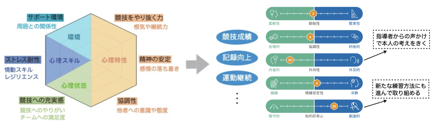 「心・技・体」のそれぞれに関するビックデータを蓄積し、AIを用いて分析することで、個人に合った競技・種目・練習方法の提案、選手と指導者のマッチング、進路選択の支援などを強化してまいります。