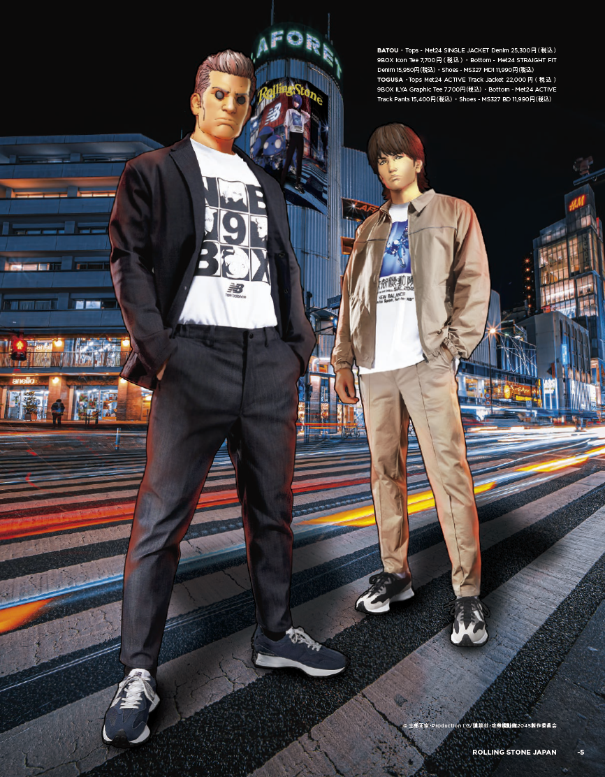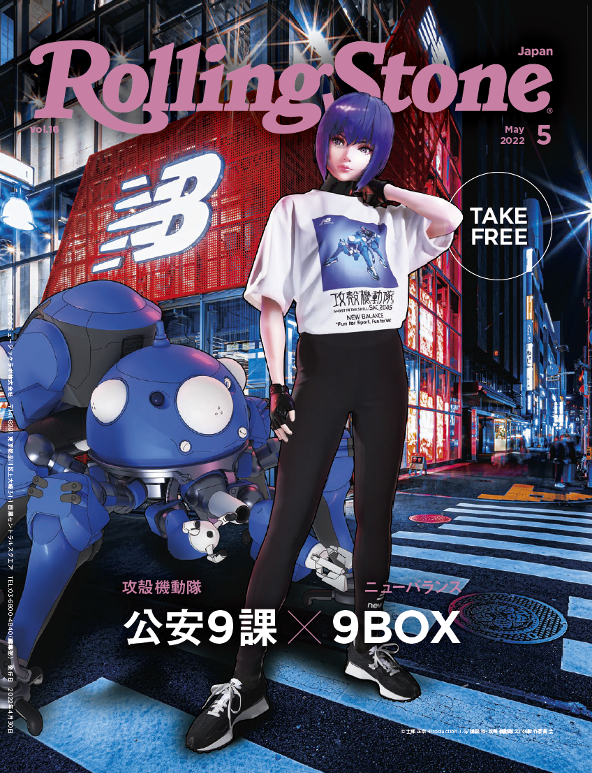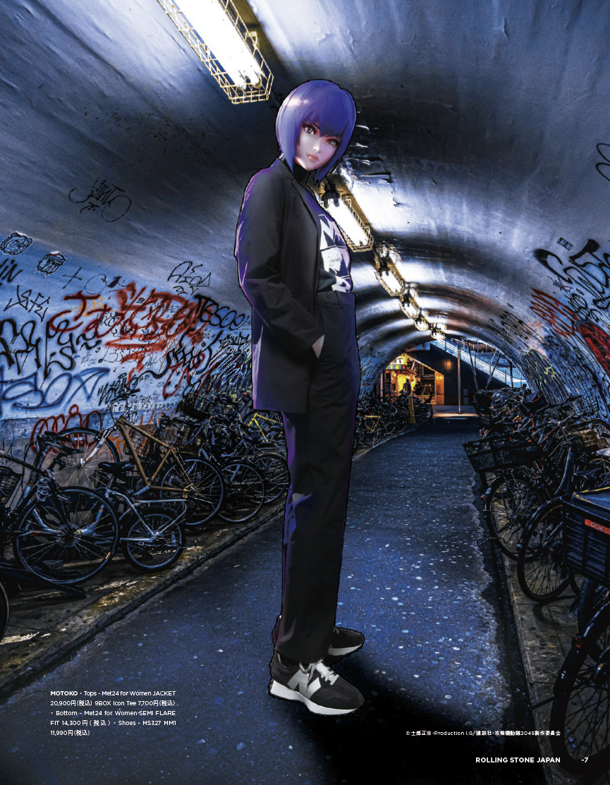 9BOXコレクションの発売を記念し、雑誌『Rolling Stone Japan』とのコラボレーションによるファッションシューティングが実現。ニューバランスのフラッグシップストアのある原宿と渋谷に、素子たちが降り立ち、都会の夜にマッチするクールな表情を見せてくれた。ファッションシューティングが収められたフリーペーパーのカバーはニューバランス原宿の前でポーズを決める素子とAI戦車のタチコマ。「公安9課×9BOX」のオリジナルTシャツが主役のコーディネートでクールに。普段戦闘服や軍服姿の素子と公安9課が、カジュアルかつスポーティなニューバランスのTシャツをスタイリッシュに着こなす姿は、ファンならずとも一見の価値あり。再開発で様変わりした渋谷の中でも、シンボリックな宮下パークの夜の風景、近未来を感じさせる原宿のファッションビル、渋谷の高架下など、印象的な街の風景の中で公安9課の面々が、9BOXやニューバランスの「MET24」などのアパレルコレクションを着こなしています。
