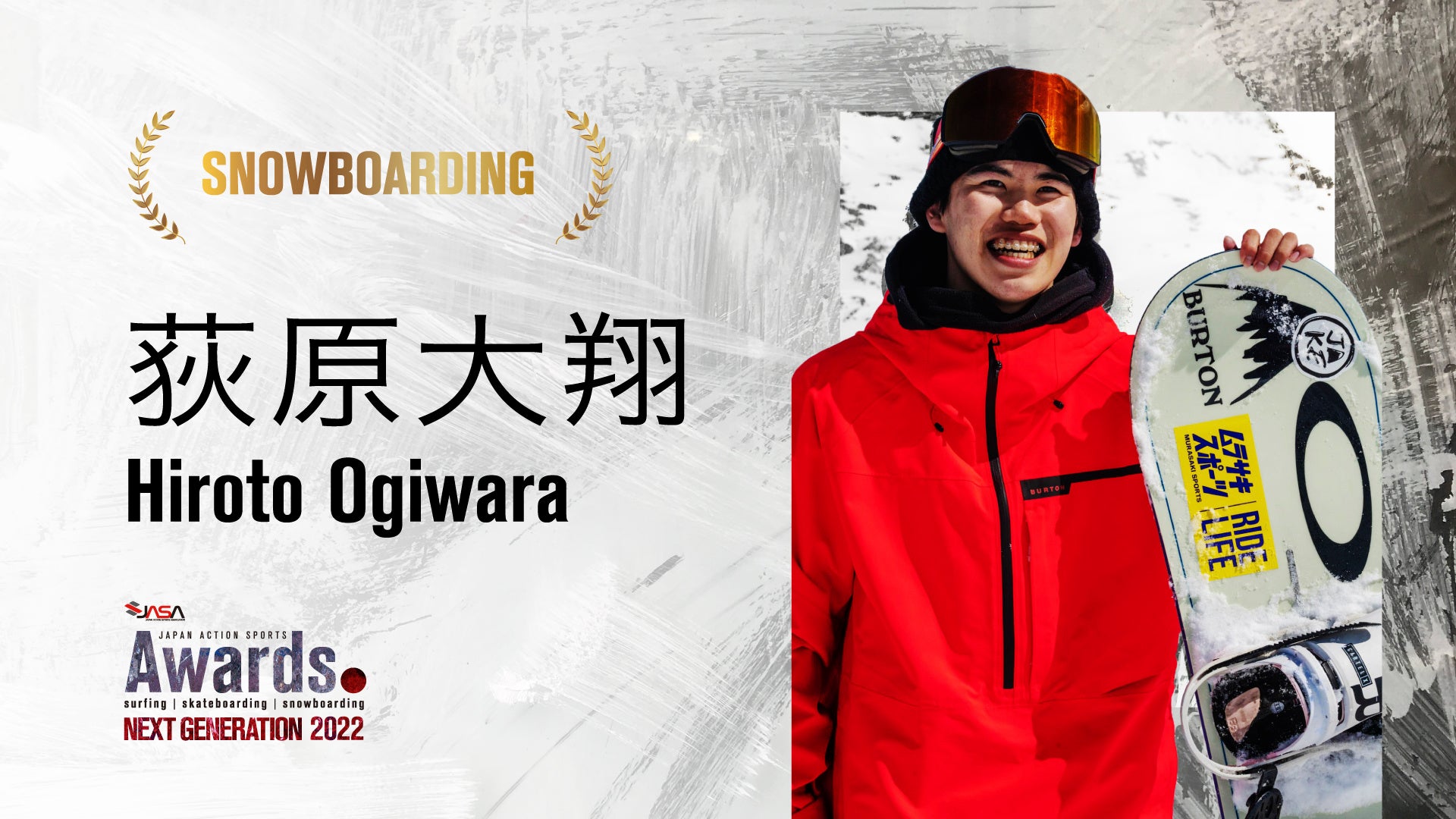 スノーボード男子は、今月、世界初となる6回転コークスピン、バックサイドクイントコーク2160という前人未到の大技を成功させ、世界に強烈な印象を残した16歳、荻原大翔が受賞。スノーボード女子は、3月に行われたFIS世界ジュニア選手権スロープスタイルで優勝を飾った15歳、村瀬由徠が受賞しました。