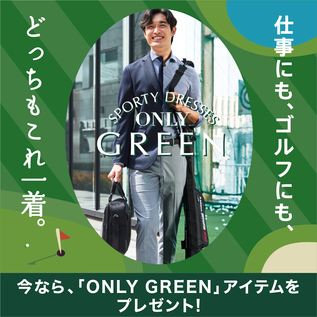 仕事帰りにそのまま練習場に立ち寄ったり、休日の装いにもウエアを兼用したり。ゴルフと日常のビジネスは、もっと密な関係になってもいいのではないでしょうか? 「ONLY GREEN」コレクションでは、ビジネスシーンに最適なクラス感を保ちながら、ゴルフシーンに役立つ実用性を備えたウエア&アクセサリーを展開。ゴルフとビジネスの新しい関係性を築けるようアプローチします。