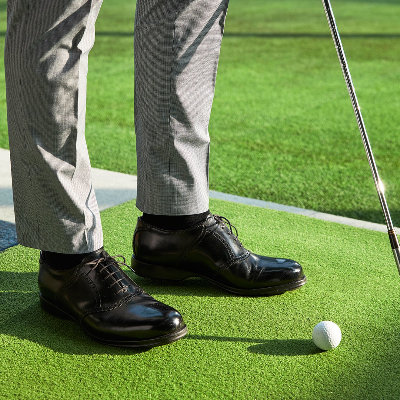 上質感のある銀付き牛革のアッパーに、クッション性に優れたイタリアF I N P R O J E C T 社のX LE x t r a l i g h tソールを組み合わせました。これにより、クラス感が求められるオンからゴルフ練習に向うアフターワークまで幅広くフィットします。ストレートチップとクォーターブローグの2 タイプ。