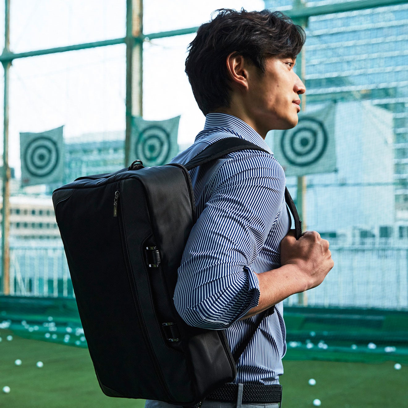 シーンを問わずに使えるよう、3 W A Y に仕上げました。内装は2 層構造で、P C や書類といった仕事道具と私物を分けて収納できます。さらには、裏地に抗菌ナイロンを使用しているので、ゴルフ練習で汗をかいた着替えも気兼ねなく入れておけます。表生地は撥水性を備えています。