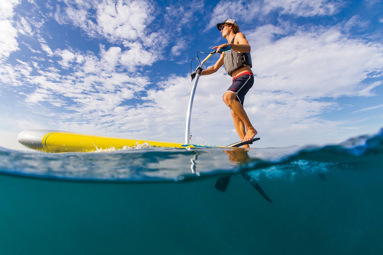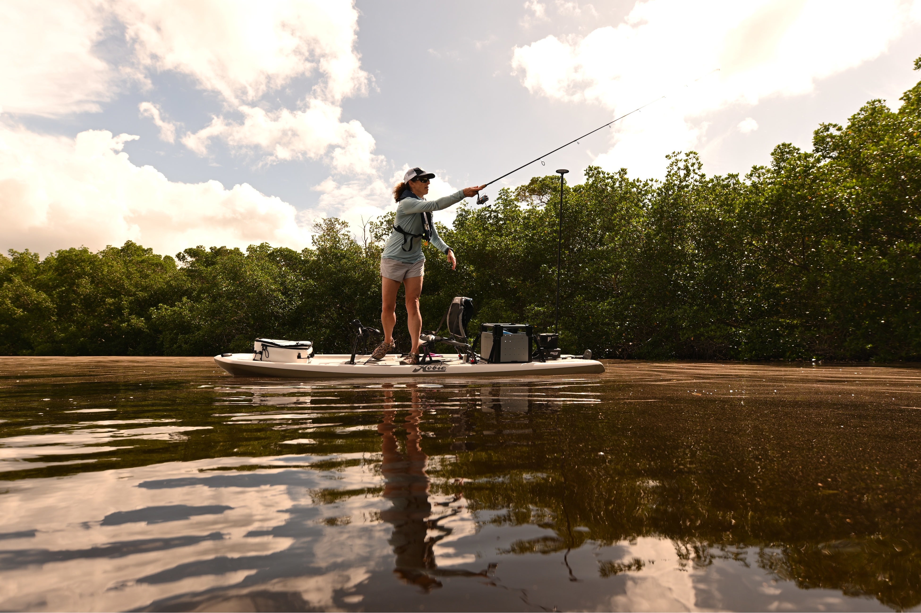 ペンギンが泳ぐ時の羽の動きに着想を得た、HOBIE社独自の足漕ぎ装置「Hobie MirageDrive」(ホビー ミラージュドライブ)は、腕よりも強く耐久性のある脚力を使うことで、効率的な推進力を生むだけでなく、水中の生き物に恐怖心を与えたり、海藻を巻き込んで自然を壊すことがないような自然界への配慮もされている。