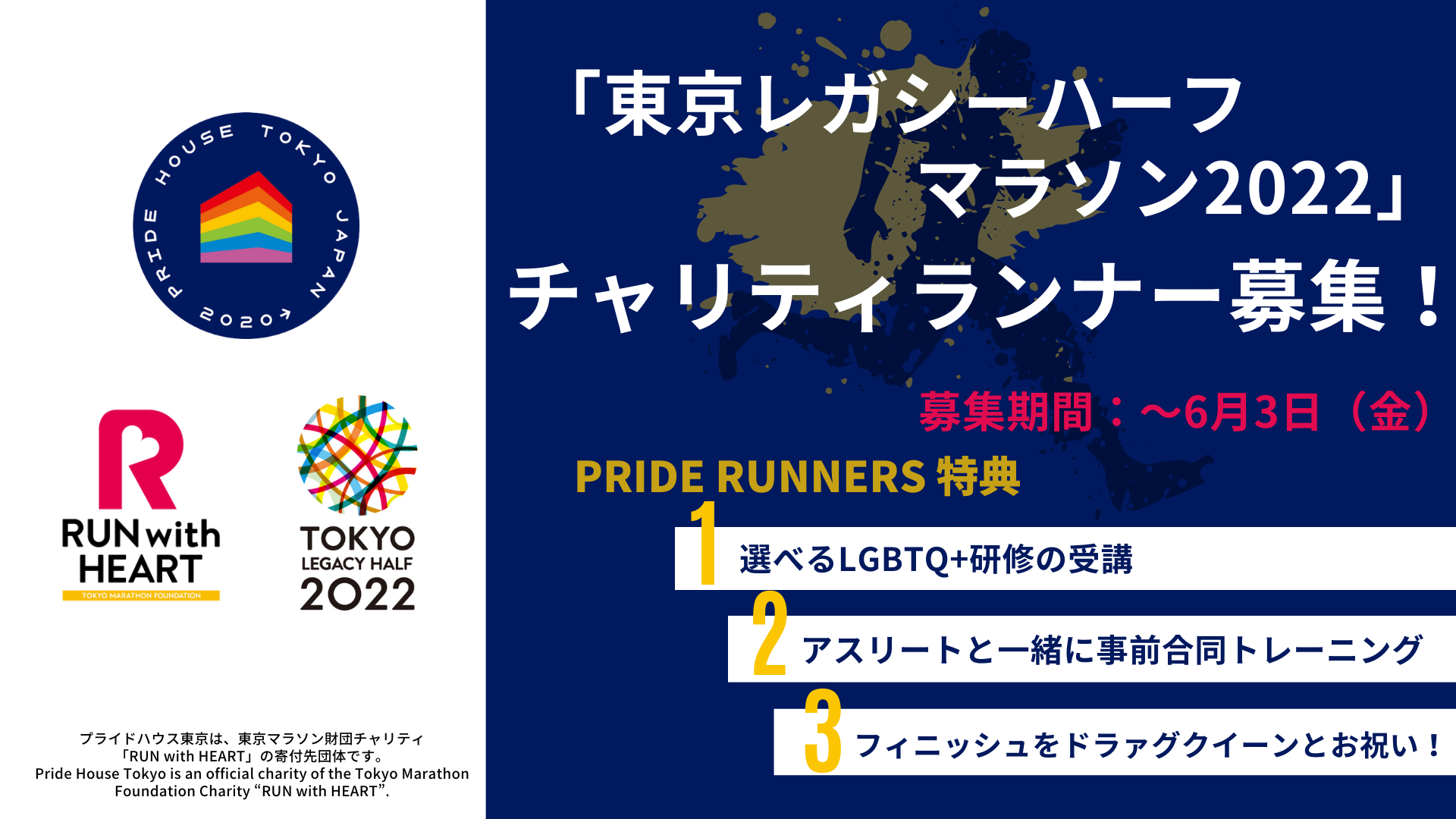 プライドハウス東京は、東京マラソン財団チャリティ「RUN with HEART」の寄付先団体として、10月16日(日)に国立競技場をスタート・フィニッシュとして開催される「東京レガシーハーフマラソン2022」に出場するチャリティランナーを83名募集します。ランナーの皆さんには特典として、選べるLGBTQ+研修やアスリートとの事前合同トレーニングにもご参加いただけます。