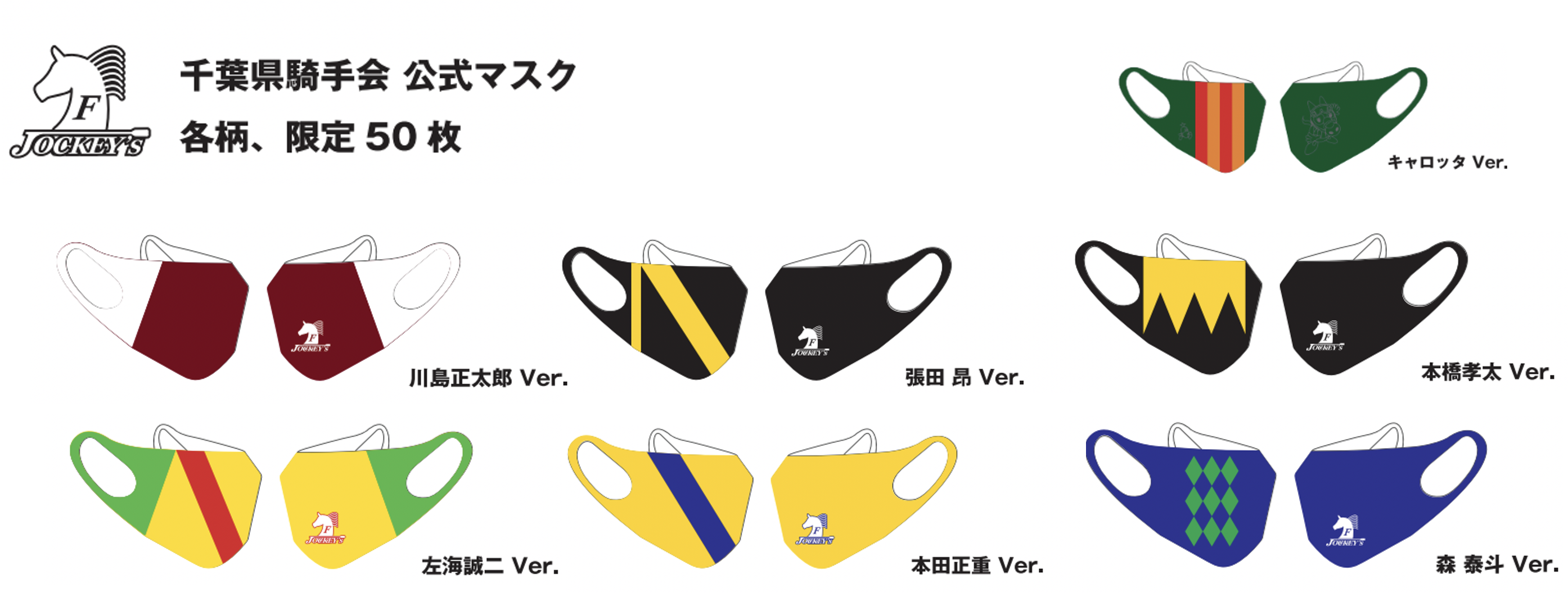 また、千葉県騎手会限定グッズ販売会も実施!販売グッズ;オリジナルマスク(森泰斗騎手、張田昂騎手、本橋孝太騎手、本田正重騎手、左海誠二騎手、川島正太郎騎手、キャロッタ 各50個 ※数量限定につき売り切れの際はご容赦ください)