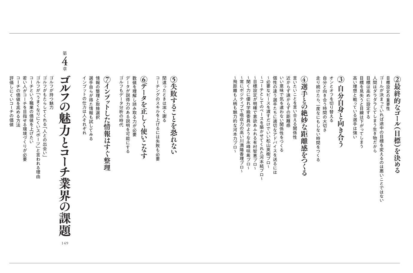 本書は、目澤コーチのゴルフとの出会い、そしてコーチングとの出会いから、プロコーチになってからの選手たちとのエピソード、目澤流コーチングの概論、これからのコーチに必要なスキル・考え方などを本人が紐解いていく、いわゆる“レッスン書”ではなく“読むゴルフ、コーチングについての本”です。