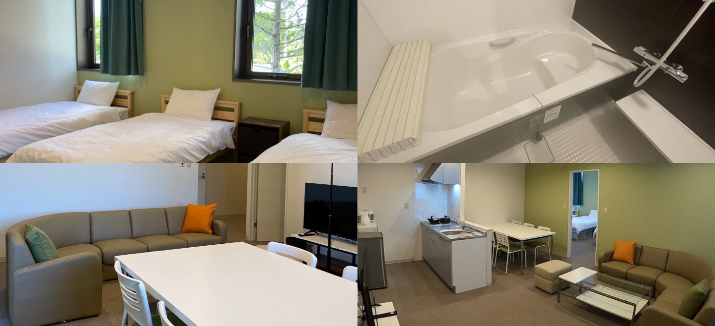 そのほか、ミーティングルーム、大浴場、マッサージルーム、コインランドリーなど長期滞在にも適した設備が充実しています。また、宿泊施設周辺には様々な商業施設や飲食店が建ち並び、長期滞在の合宿などでも不便がありません。フロアごとにセキュリティシステムがありますので、安心してお過ごしいただけます。