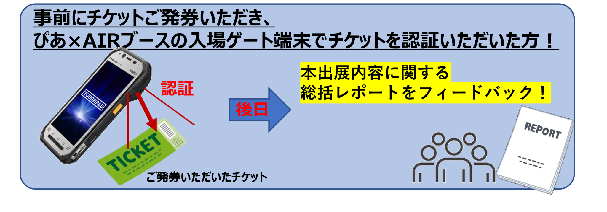 ・ご回答いただきましたお客様には改めて、弊社よりご案内メールをお送りさせていただきます。その際、ブースにてチケット認証を体験いただくためのチケット購入サイトをお送りさせていただきます。