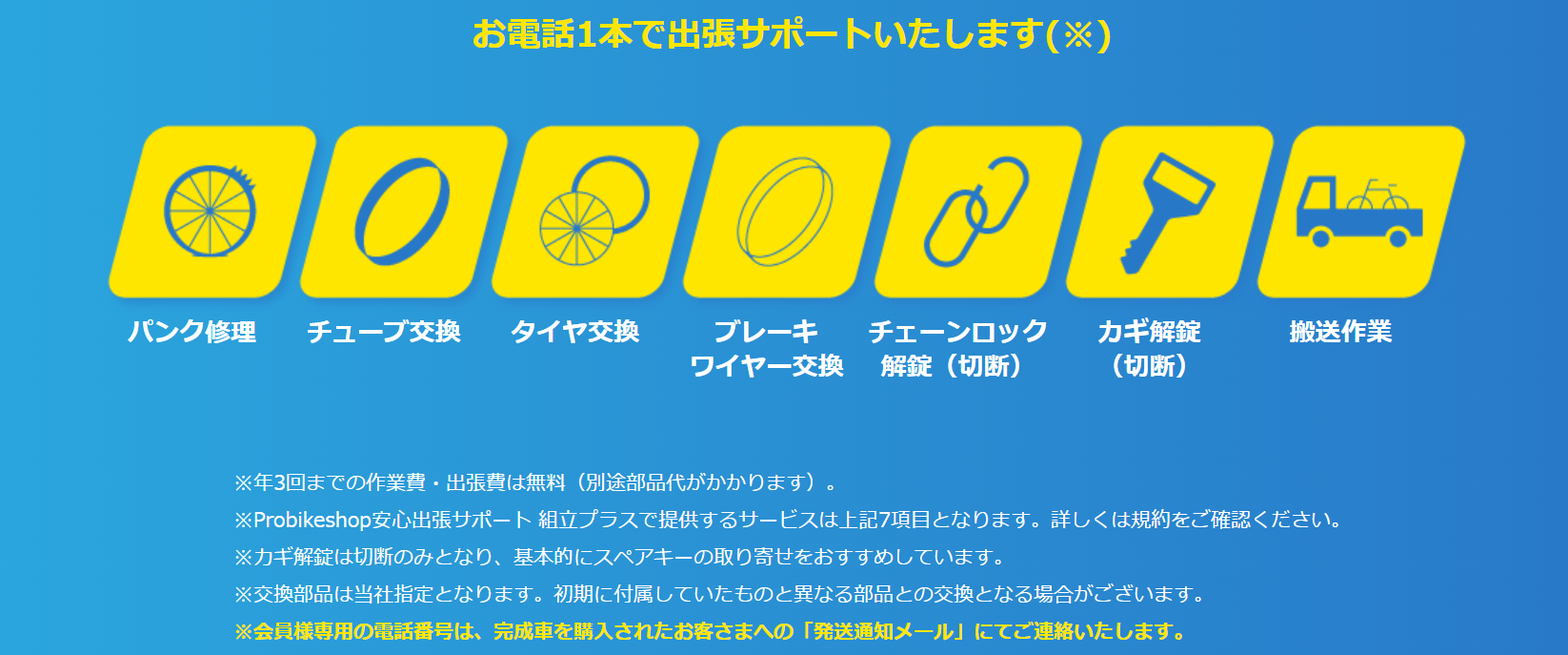 Probikeshopで自転車をお買い上げの方は、電話一本で車体組み立てサービスと出張メインテナンスサービスが無料で(年間3回無料)ご利用できます。また、防犯登録も当社で承ります(東京都限定となります)。ネットで手軽に購入できて、アフターメインテンスも充実!是非、Probikeshopのサービスをお楽しみください。