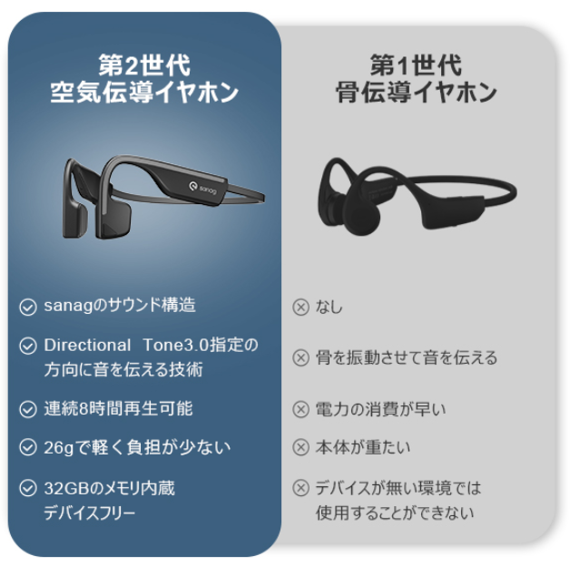 空気伝導イヤホンは、骨伝導イヤホンの技術革新を受けて第2世代にグレードアップした新商品です。耳に入らないオープンイヤーデザインという骨伝導イヤホンの特徴を生かしながら、「振動に慣れないしないと聴こえない」、「電力の消費が早い」、「本体が重たい」などの問題点を改善し、耳に優しくなりました。