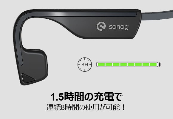 空気伝導イヤホンは骨を振動させるエネルギーが必要ないので、1.5時間の充電で連続8時間の使用が可能です。