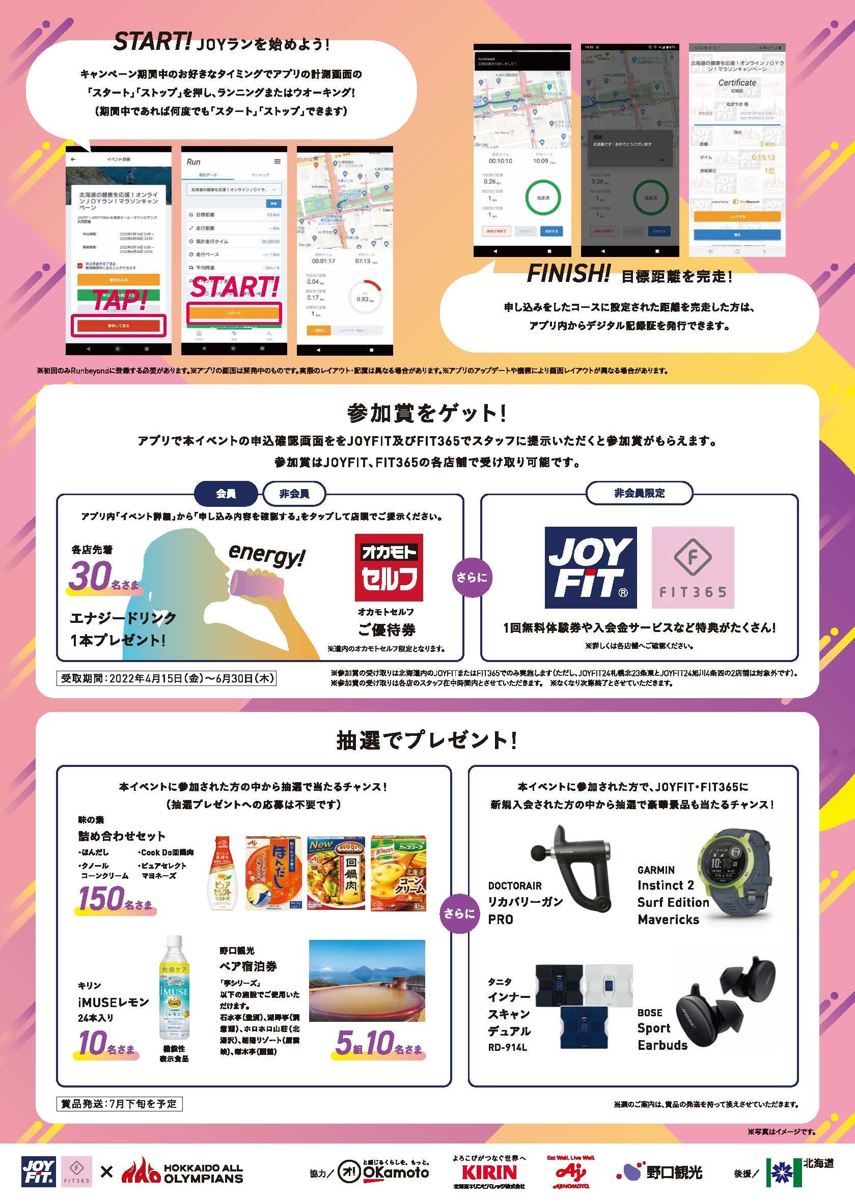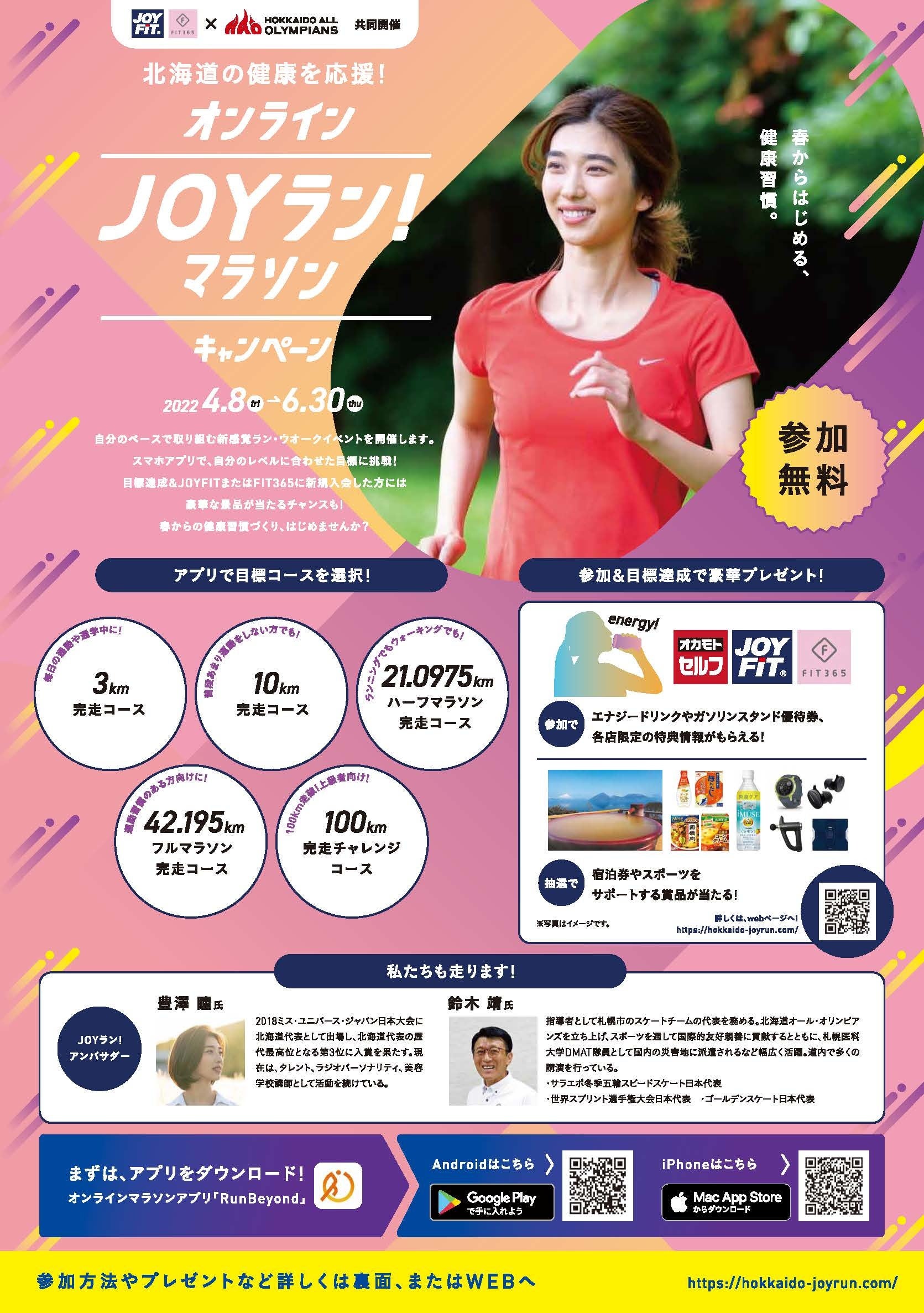 JOYFIT・FIT365と北海道オール・オリンピアンズによる「JOYランキャンペーン」が6月30日まで開催中です。参加費は無料で豪華景品があたります。3㎞、10㎞、ハーフ、フル、100㎞の5コースより選択可能。オンラインマラソンアプリ「RunByond」のダウンロードが必要となります。
