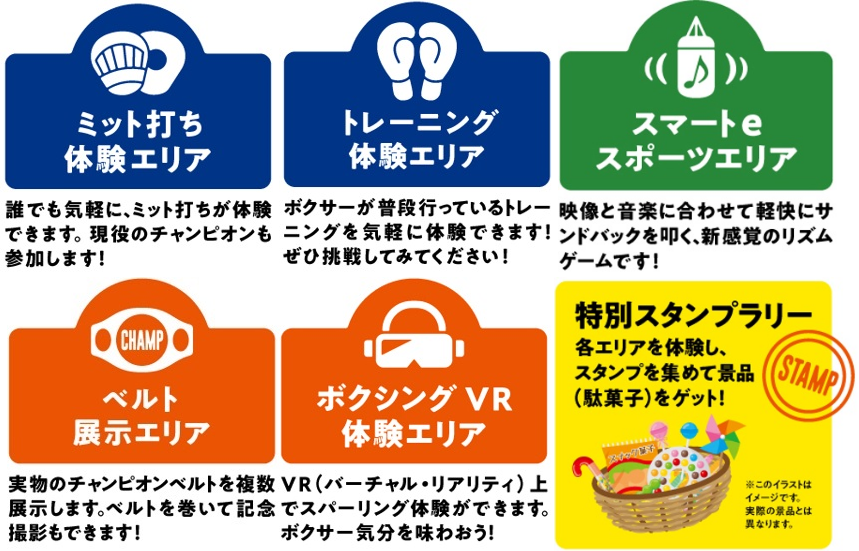 やって楽しめるイベント「チャンピオンによるミット打ち体験、ボクシングVR体験、スマートeスポーツ、ボクシングトレーニング体験等」、子ども向けイベント「スタンプラリー」等を実施します。