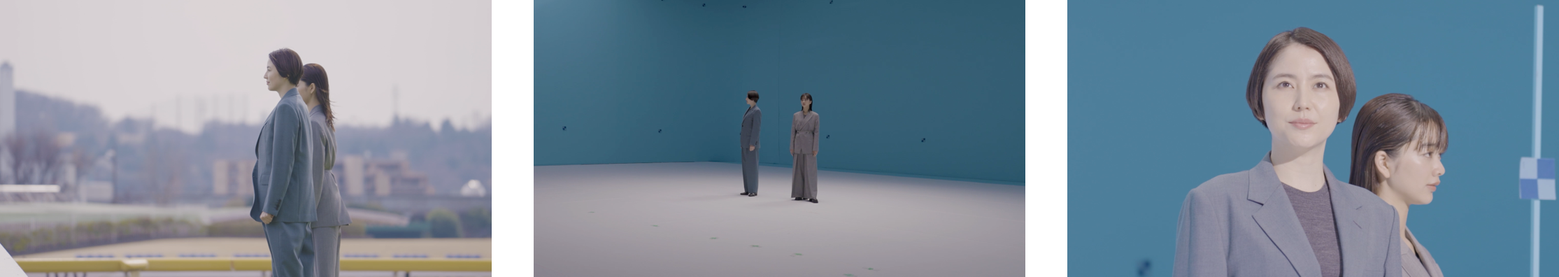 撮影は、東京競馬場から始まりました。撮影前日にみぞれが降ったような状況で、当日は冬空の下、非常に寒い一日となりました。足元から冷えこむであろう芝の上でも、常に優雅で凛とした長澤さんの佇まいと、元気溢れる笑顔の見上さんが印象的でした。東京競馬場での撮影を終えた後はスタジオへ向かい撮影を執り行いました。長澤さんと見上さんは、何度も共演を重ねているので、お二人で声を重ねてセリフを言う部分は息もぴったりでした。移動込みの長丁場の撮影にもかかわらず、疲れなどは一切感じさせず、撮影直後のサプライズの花束でチャーミングな驚きを見せる長澤さんや、最後の最後まで元気ハツラツの見上さんに、スタッフからも笑顔がこぼれました。