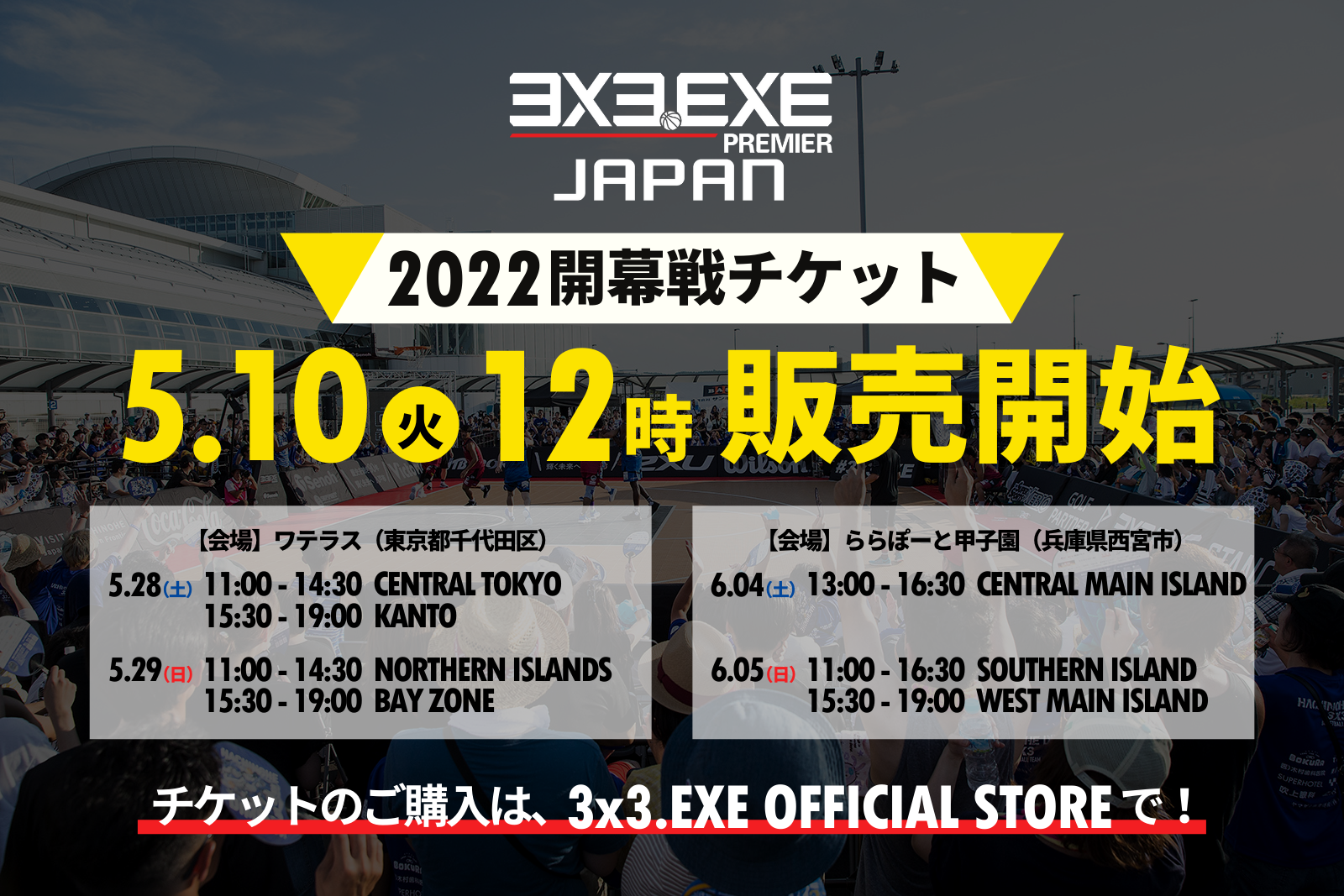 ゼビオグループのクロススポーツマーケティング株式会社(本社:東京都千代田区 代表取締役社長:中村 考昭)が運営する3人制バスケットボールのグローバルリーグ「3×3.EXE PREMIER」は、5月28日(土)~29日(日)にワテラス(東京都千代田区)、6月4日(土)~5日(日)にららぽーと甲子園(兵庫県西宮市)で行われる「3×3.EXE PREMIER JAPAN 2022」男子開幕戦の観戦チケットを5月10日(火)12:00より、「3×3.EXE OFFICIAL STORE」で販売を開始いたします。