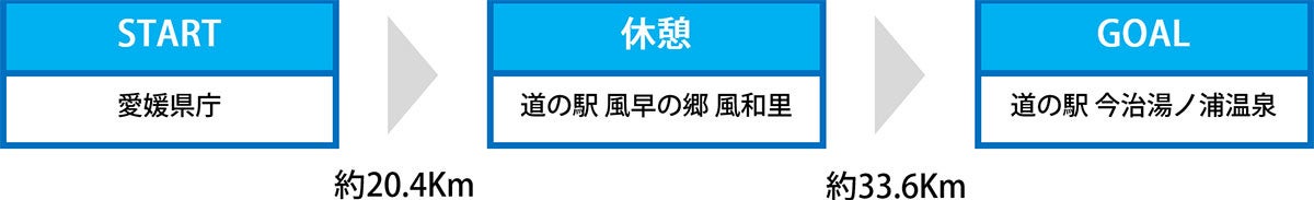 愛媛県庁(愛媛県松山市)を出発し、道の駅今治湯ノ浦温泉(愛媛県今治市)まで約54kmのコースとなります。途中、道の駅でお昼休憩など複数回の補給タイムを設け、快適なサイクリングをサポートします。