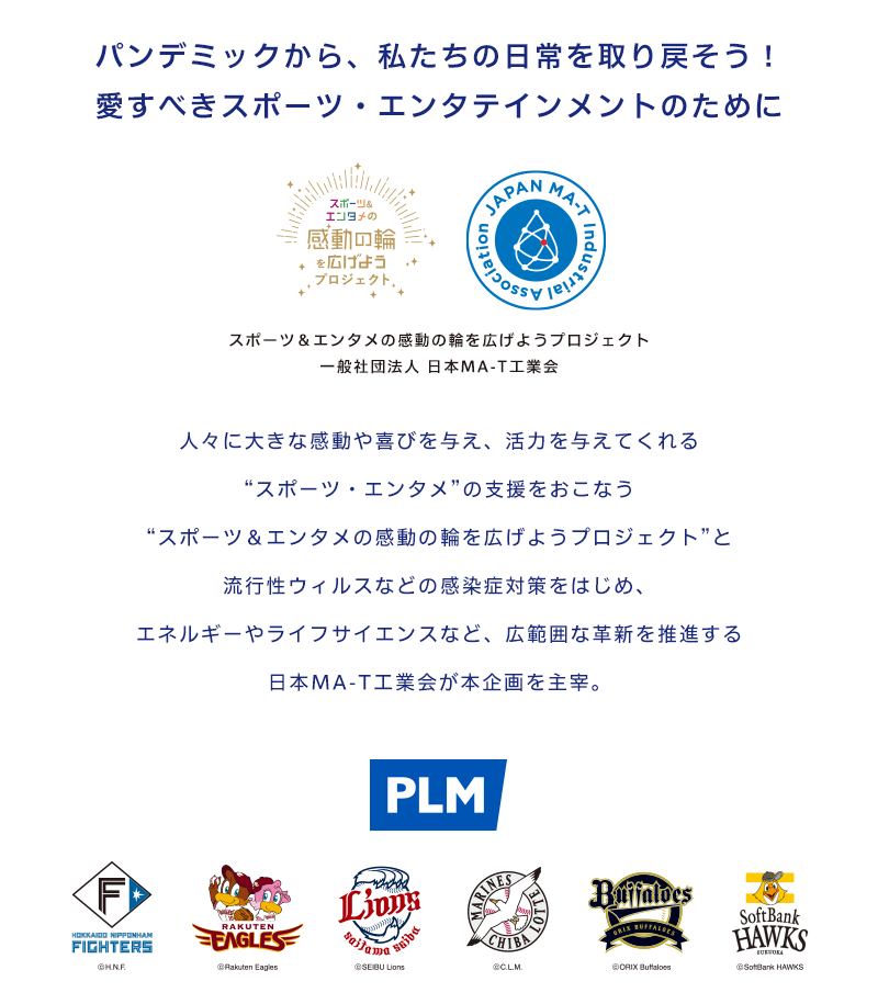 『パ・リーグ6球団感動の輪を広げようプロジェクト』は、「パシフィックリーグマーケティング株式会社」と「一般社団法人 日本MA-T工業会」が協力している「スポーツ&エンタメの感動の輪を広げようプロジェクト」が行う共同プロジェクトです。本プロジェクトは、長引くコロナ禍で失われてしまった球場での感動や興奮、一体感を取り戻すために活動してまいります。
