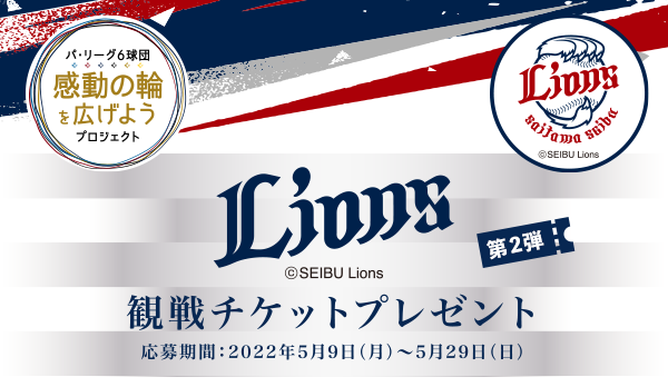 第二弾は、6月19日(日)に埼玉県のベルーナドームにて行われる埼玉西武ライオンズ vs オリックス・バファローズ戦の観戦チケット(内野指定席A)を40組80名様にペアでプレゼントいたします。また、エッセンシャルワーカーのご家族の方を対象に試合前フィールドイベント<ベースランニング>参加権付き観戦チケット(内野指定席A)をペアで10組20名様にプレゼントいたします。奮ってご応募ください。