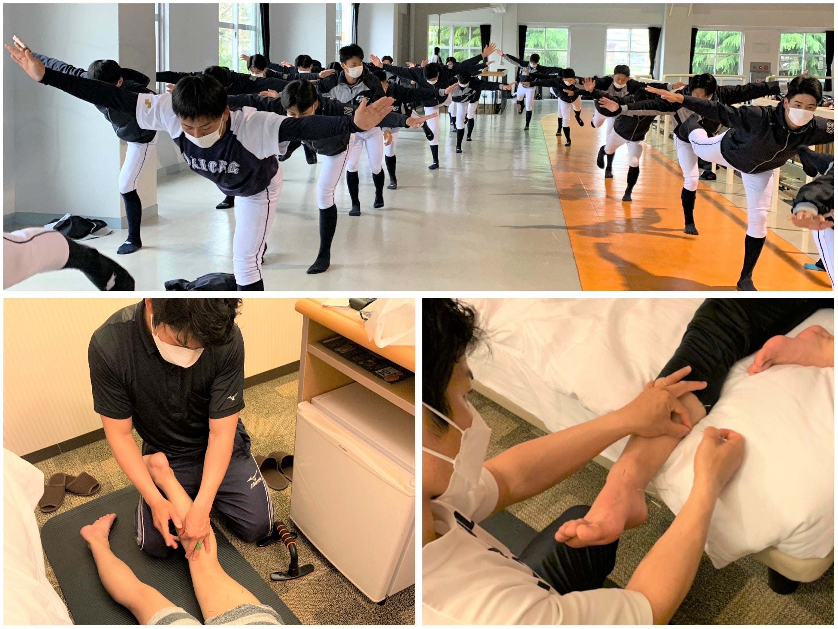 試合前には体感トレーニングやストレッチなどの指導を行い、身体に不安をかかえる選手に治療やテーピングを行いました。