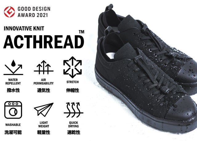 糸の状態から撥水加工を施して編み上げた独自のニット素材〈ACTHREAD TM(アクスレッド)〉を採用。水の持つ表面張力を利用する特殊な加工で、水だけでなく汚れに強いのもポイント。繰り返し洗っても撥水性が弱まりにくいのが特徴です。この1足があれば、もう雨の日のためのシューズを備えておく必要はありません。