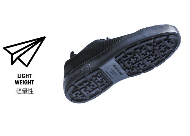 アウトソールには歩行時の動きに基づいて設計された〈ADVANCED SOLE TYPE-GOLF〉を採用。軽量かつ衝撃吸収性に優れた発泡ゴムをベースに、耐摩耗性の高い硬質ゴムを適所に配置。クッション性とグリップ性を同時に備えているのが特徴です。特にかかと部分には摩耗に耐える素材配合になっています。水はけがよく、雨の日のはき心地も快適です。
