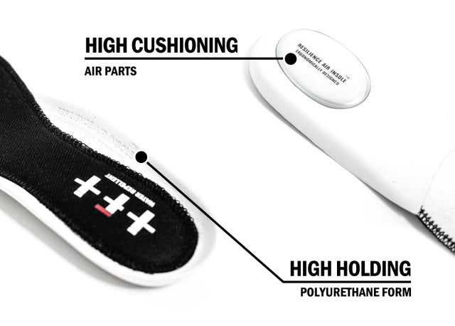 インソールには、人間工学に基づいた〈RESILIENCE AIR SOLE〉を採用。歩行時にエアーパーツが衝撃を吸収し、アーチを支え、かかとから土踏まずにかけてしっかりホールド。膝や腰への負担を軽減する設計になっています。また、素材にポリウレタンフォームを使うことで優れたクッション性も兼備させました。