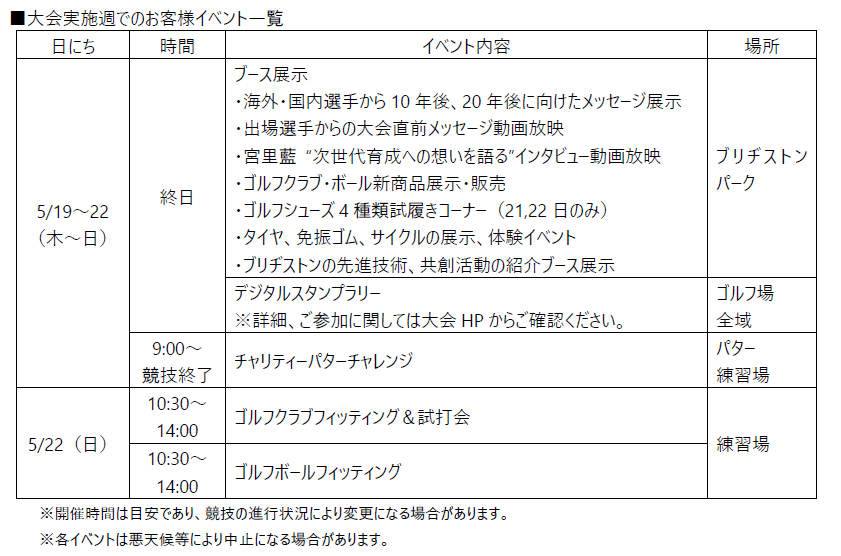 自転車といったブリヂストングループの製品に関する展示や体験イベント、さらには「Bridgestone E8 Commitment」や当社グループと一緒に共創活動いただいているパートナー企業との新しい価値創造の展示を行います。また、「ブリヂストンレディスオープン」では、チャリティーパターコンテスト、ジュニアレッスンによる次世代育成、紙の削減や運営ツールの環境負荷低減素材への置き換え等、「Bridgestone E8 Commitment」とSDGsの活動を通じサステナブルな大会運営を推進してまいります。