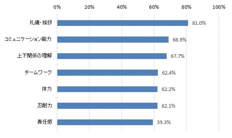 運動部の活動を通じて身についた強みの上位3位は、「礼儀・挨拶(81.0%)」「コミュニケーション能力(68.9%)」「上下関係の理解(67.7%)」だった。そのほか、「チームワーク(62.4%)」「体力(62.2%)」「忍耐力(62.1%)」も割合が高く、異なる年代・年齢で構成された競技チームにおいて、コミュニケーション方法や振る舞いを身につけている様子が見てとれる。【図5】