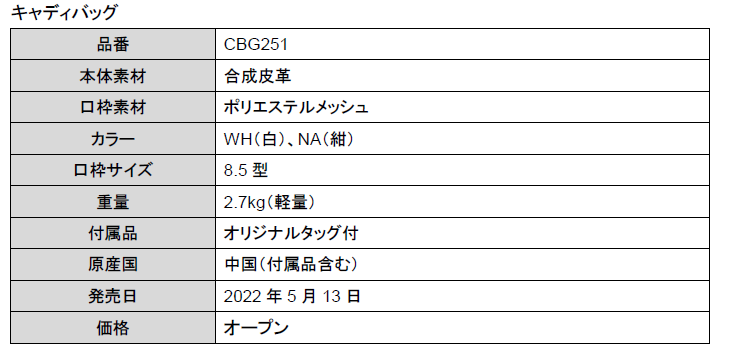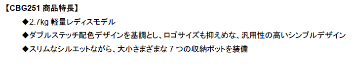 『CBG251』は、ダブルステッチを基調としたシンプルデザインでスリムなシルエットながら、大小さまざまな7つの収納ポケットを装備しています。活況なレディス市場の中でより幅広い世代の女性ゴルファーに向けたモデルです。当社はゴルフにおける様々な“接点”を、タイヤ開発で培われた独自の解析やシミュレーション技術などを活用し「接点を科学」することで、ユニークな商品開発やサービス提供に繋げ、ゴルファーの皆様にワクワク感や笑顔、感動をお届けしていきます。