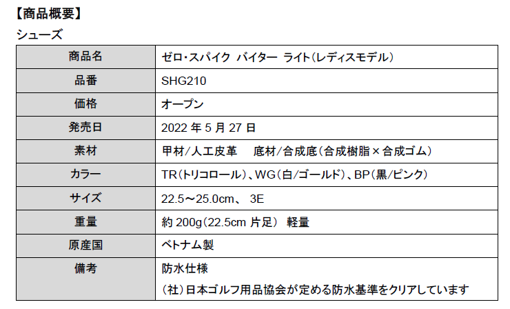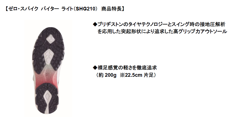 『ゼロ・スパイク バイター ライト(SHG210)』は、片足約200g(22.5cm)の軽量設計ながらツアープロも認める高グリップ性能ソールを搭載したスパイクレスシューズです。前作モデルと比較してシューズ内部のスポンジを増量しやわらかな履き心地を実現しており、当社契約の古江彩佳も着用しています。