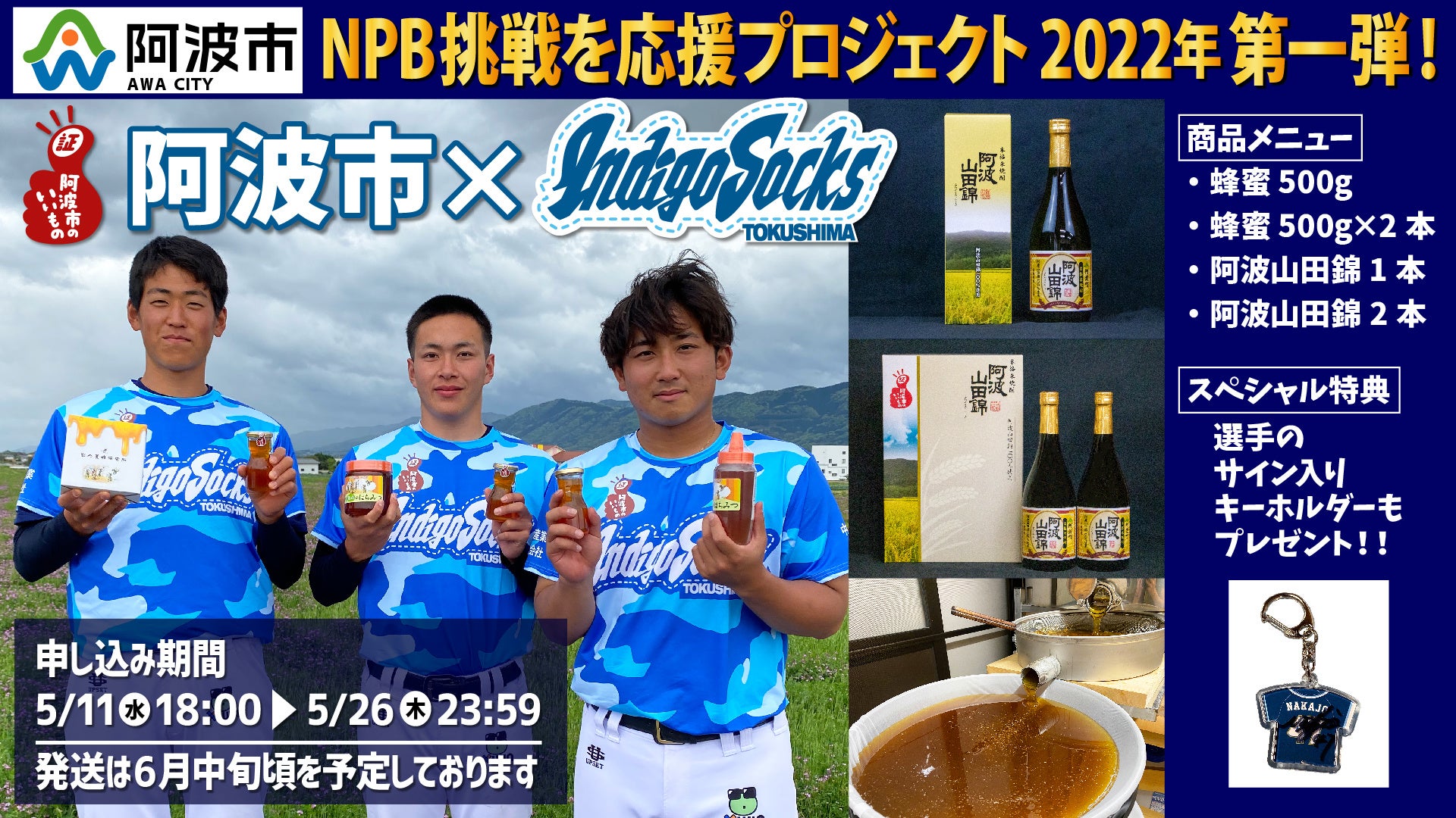 阿波市産野菜や果物を広く告知、販売するプロジェクトを共同で行い、この活動によって得た収益の一部を徳島インディゴソックスの選手活動費とさせていただきます。そのため、商品を購入していただくことが選手の応援、そして未来のNPBスター選手の輩出につながっていきます。第1弾のお申し込み期間は5月11日〜26日まで。※お届けは6月中旬を予定