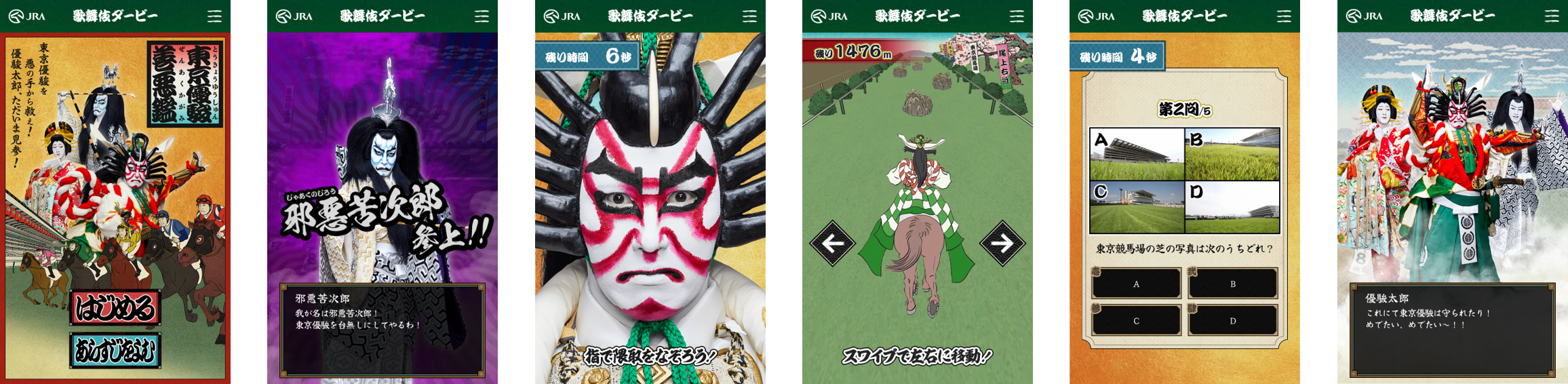 レースゲームなどを楽しめる「東京優駿善悪鑑(とうきょうゆうしゅんぜんあくかがみ)」では、⽇本ダービーのためだけに歌舞伎を取り⼊れたオリジナルストーリーを展開。障害物レースや、⽇本ダービーに関するトリビアクイズが楽しめます。