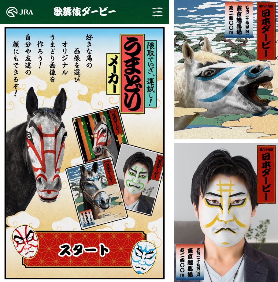 さらに、⾺の画像や、⾃分や友⼈などの顔にオリジナルの隈取を合成できるコンテンツや、⽇本ダービーの結果に応じて賞品が当たるTwitterキャンペーンなども実施いたします。ぜひお楽しみください︕