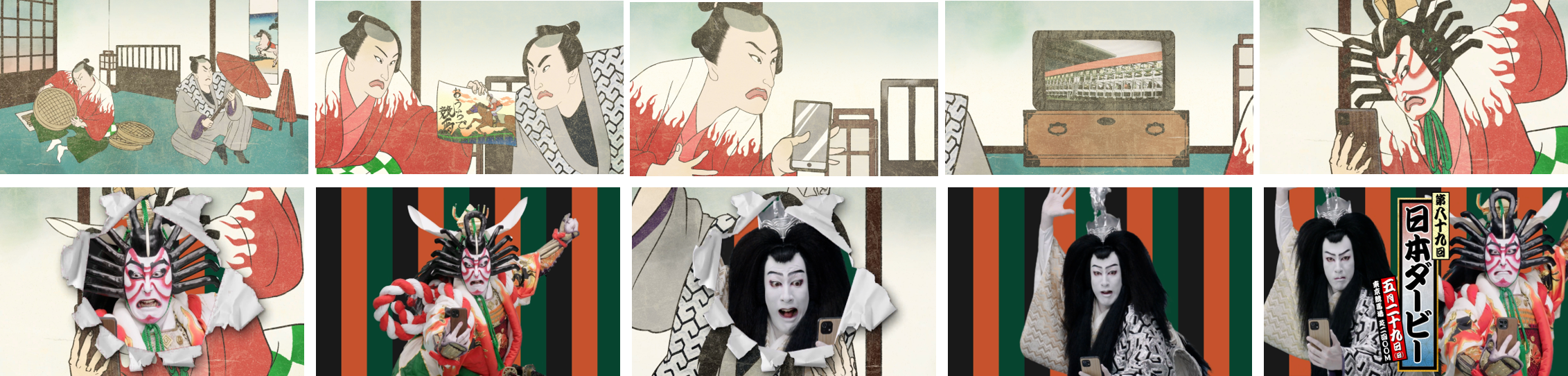 時は江戸時代、長屋が連なる部屋の一角で、仕事に精を出す優駿太郎(尾上松也)と駿馬次郎(尾上右近)。休日にも関わらず働いていることに愚痴を漏らしますが、偶然手に入れた引き札に書いていた「おうちで競馬」の文字に二人の心は惹かれます。しかもスマートフォンでできるということで、休憩も兼ね、一発運試しをする二人。それぞれ応援する馬を選び、レースがスタートします。レース開始直後から二人の熱気は最高潮。終盤、白熱しすぎた優駿太郎の顔には隈取が浮かび上がり、駿馬次郎は髪が長く伸びてきてしまいます。結果は駿馬次郎の勝利!しかし、優駿太郎は「本番は日本ダービーでござるし」と、日本中が注目する次回のレースでリベンジを誓うのでした。