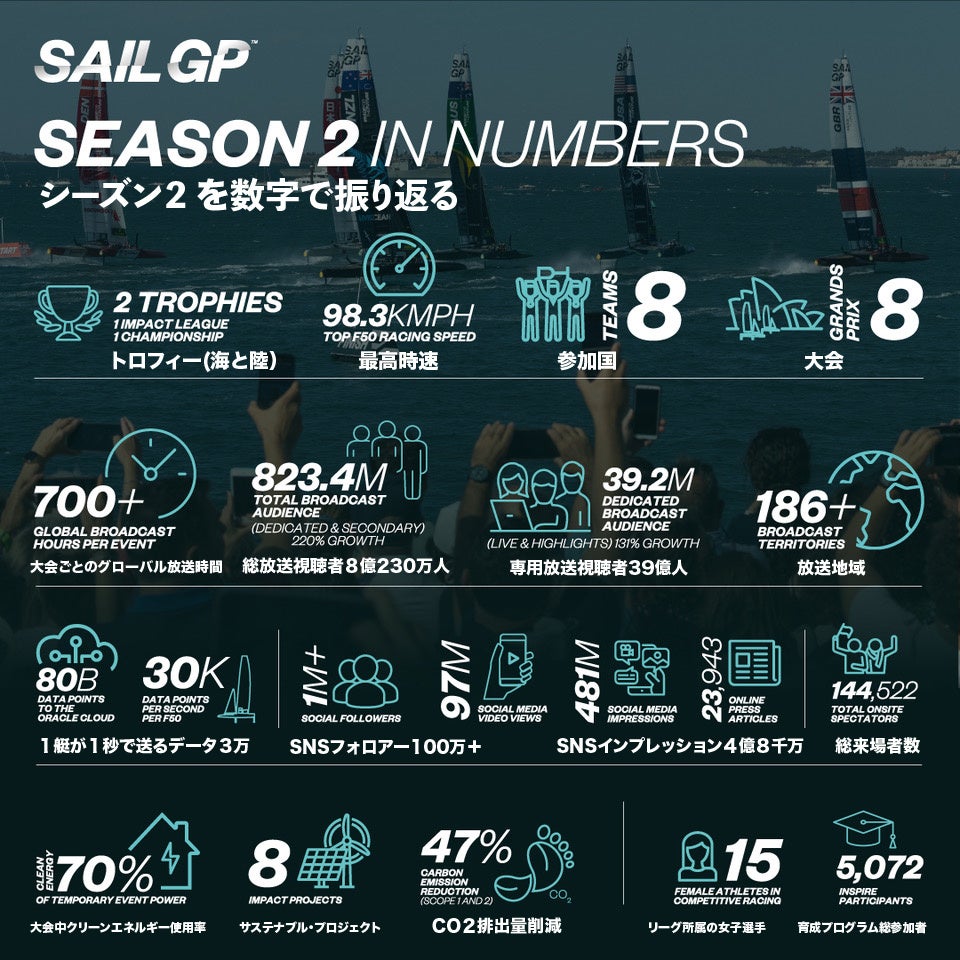 当リーグはシーズン2で6チームから8チームに拡張、全8大会を開催しました。 その間、SailGPの総放送視聴者は220%増加して累計8億2340万人の視聴者を記録しました。日本国内ではJ SPORTSがライブ及びオンデマンドで放映した専用放送視聴者は全世界で3920万人が視聴。これはシーズン1の131%増に相当し、リーグは世界中でより注目され、多くのファンに視聴されました。同時にメディアの報道も大幅に増加。SailGPについて書かれた記事は2万3943件にのぼり、シーズン1から246%増加しました。