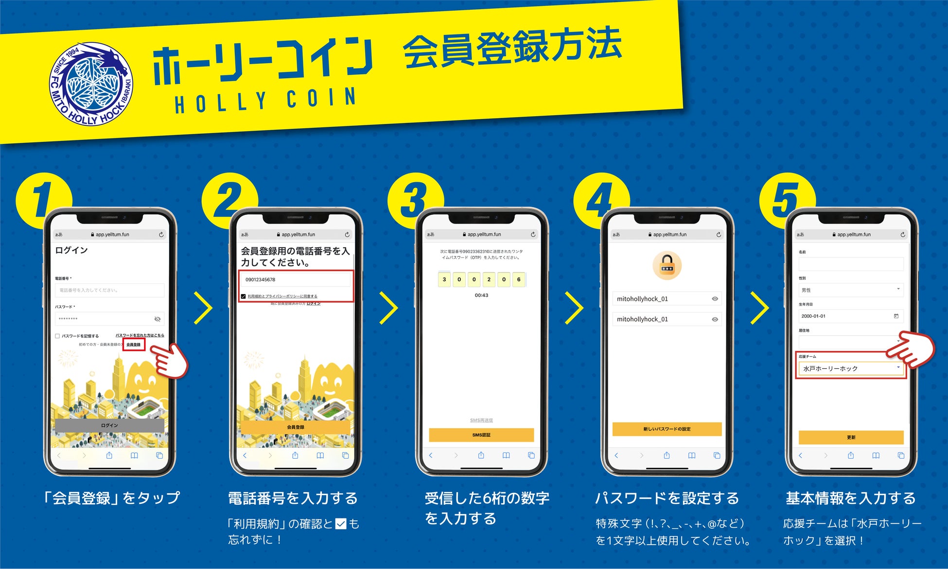 YELLtum上で発行される「ホーリーコイン」を活用し、SNS上で投稿などのアクションを起こすだけでコインの獲得が可能になります。コインは水戸ホーリーホックが開催するキャンペーンや地域の飲食店でご利用いただけます。