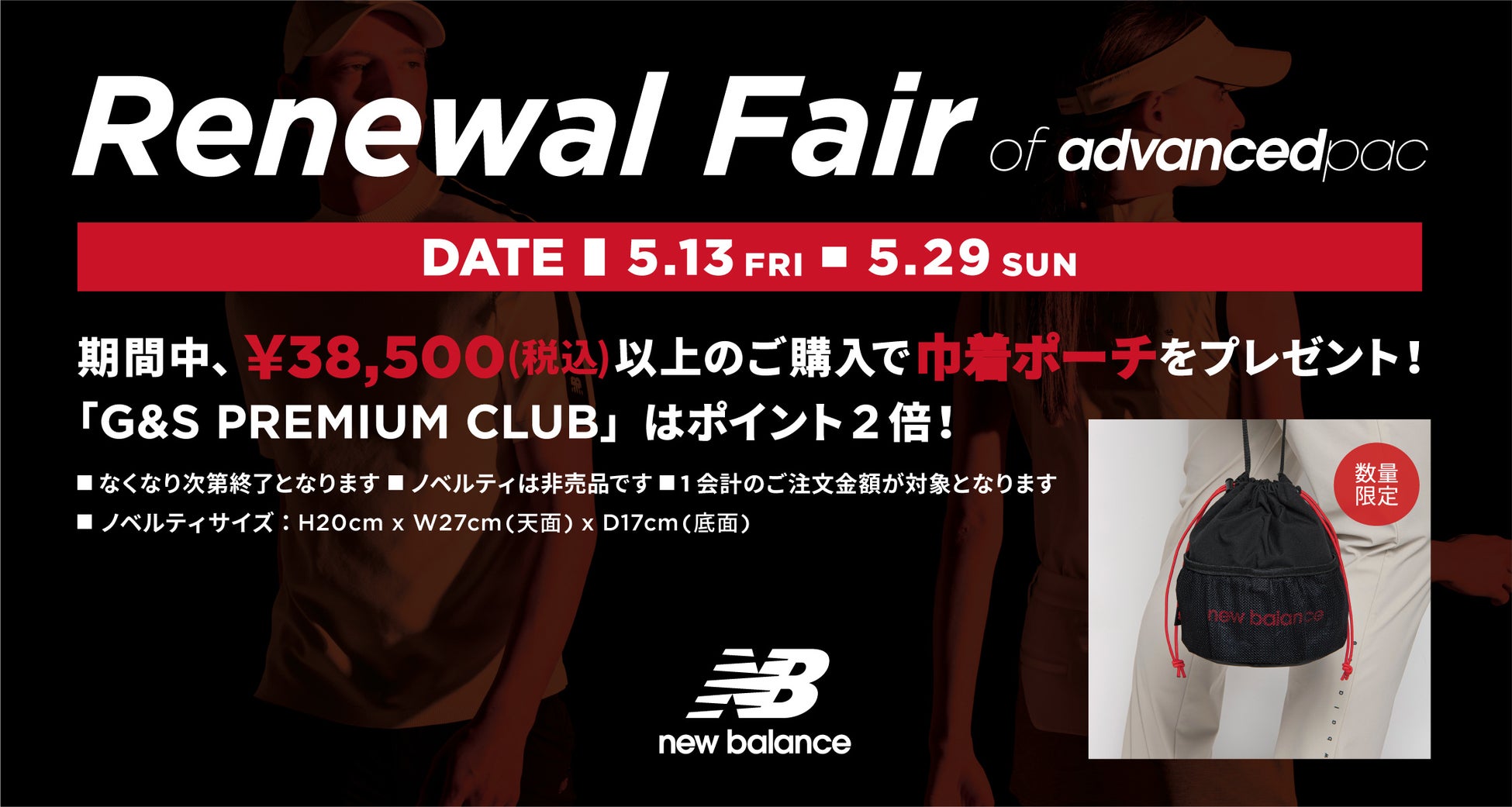 5月13日(金)~5月29日(日)までの期間中、「Advanced pac」の商品を含む 1レシート¥38,500(税込)以上のご購入のお客様に 巾着ポーチ(H20cm×W27cm×D17cm) をプレゼントいたします。