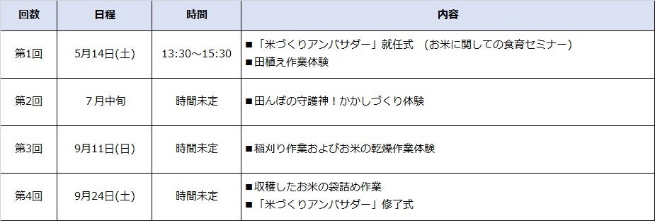本企画では、日本人の主食であるお米の消費量が年々減少することに対し、「米づくりを通じて、お米の素晴らしさを知ってほしい!」という趣旨の下、参加者の皆様に「田植え」&「稲刈り」など、米づくりに関する体験を全4回の構成で体験いただきます。