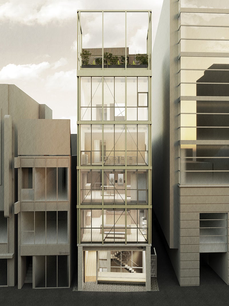 素材と技法への真摯な探求が高い評価を得ている気鋭の建築家ユニット、「Sawada Hashimura(澤田航と橋村雄一による主宰)」が、「もしその場所に建築物が樹木のように発生したのなら?」という発想からデザインされたこのビルは、自然の持つ合理的で無駄のない美しさに学び、THE NORTH FACEのものづくりでも実践されている「最少のもので最大の効果を得る」ミニマリズムの姿勢が体現されています。建築全体の軽量化や、外皮性能を高めることによる消費電力の削減など、環境・資源を配慮した構造になっており、自然と調和する設計となっています。