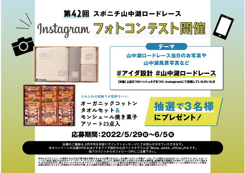 今回アイダ設計は、第42回 スポニチ山中湖ロードレースに協賛し、優勝者への副賞の贈呈と、来場者のみ応募ができる2つのSNSイベントを実施します。フォトコンテストでは、大会当日のお写真や山中湖風景のお写真を「#アイダ設計」「#山中湖ロードレース」という2種類のハッシュタグをつけてインスタグラムで投稿すると抽選で3名様に豪華プレゼントが当たるキャンペーンです。また、アイダ設計のLINE公式アカウントとお友だち登録すると、大会当日のアイダ設計ブースで先着500名に「コツミくんクールタオル」をプレゼントします。詳しくは当日のアイダ設計ブースで御確認ください。