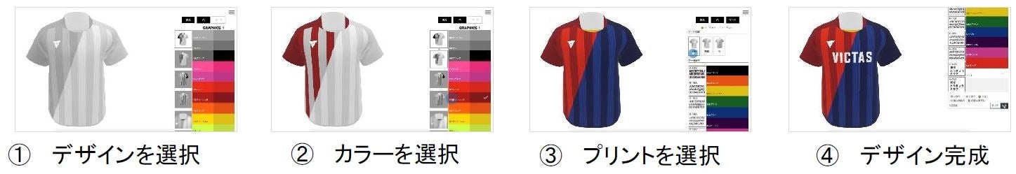 VICTAS EZ CUSTOM は、4 ステップで簡単に自分だけのオリジナルウェアを制作することができる WEB サービ スです。WEB上でデザインを確認しながら、カラーやチーム名の有無などを選ぶことができるため、自分好みの ウェアを誰でも簡単に作ることが可能です。