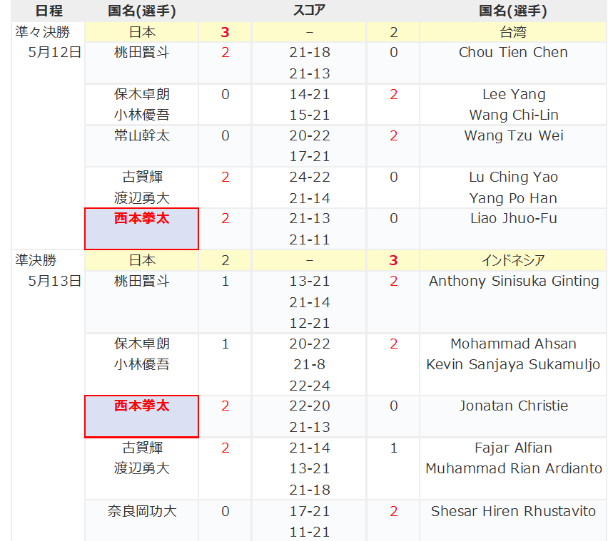 準決勝は強豪インドネシアと対戦し、第1シングルス、ダブルスを先取され0勝2敗の後がない場面で第2シングルスに出場し、世界ランキング8位の格上の選手と対戦。第1ゲームを接戦で制すると第2ゲームは多彩なショットで相手を圧倒し勝利しました。西本選手の活躍で日本は決勝進出に望みをつなぎましたが、最後は2勝3敗で準決勝敗退となりました。