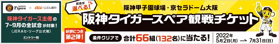 また、2022年5月2日からは「試合が選べる!阪神タイガースペア観戦チケットプレゼントキャンペーン」を実施しています。auじぶん銀行口座をお持ちで、適用条件を達成(エントリー完了・円普通預金残高10万円以上)したお客さまの中から、抽選で合計66組(132名)に阪神タイガースJERAセ・リーグ公式戦のペア観戦チケット(阪神甲子園球場・京セラドーム大阪)をプレゼントします。阪神タイガース主催の7月から9月の全試合の中からご希望の試合を選んで応募できます。