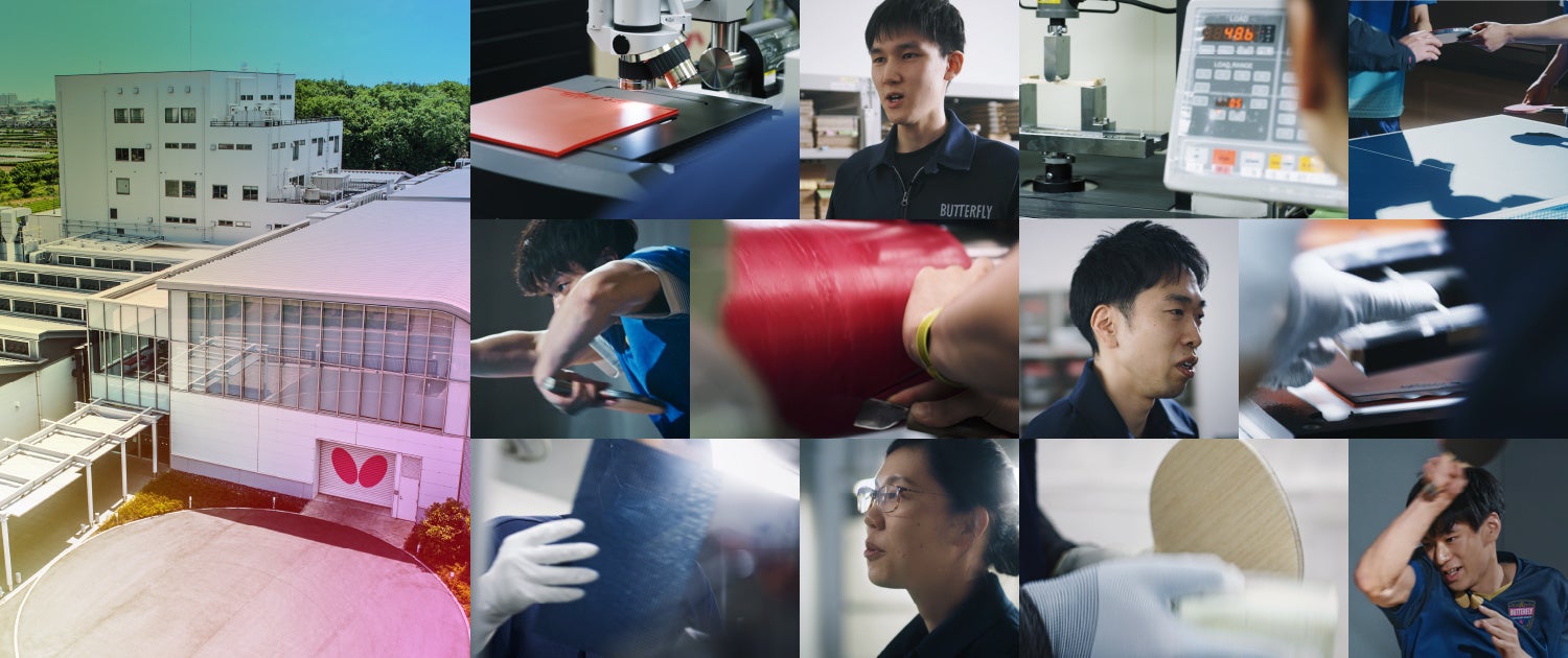 ムービーの中では、これまで公開されることのなかったシーンを含むラケット・ラバーの製造工程のほか、研究開発、ラバー生産、ラケット生産、各分野の業務に従事するスタッフが、自身の仕事への思いをコメントしています。また、バタフライ・アドバイザリースタッフ(契約選手)の戸上隼輔選手と宇田幸矢選手が登場し、愛用してきたバタフライの用具とバタフライへの思いを語っています。