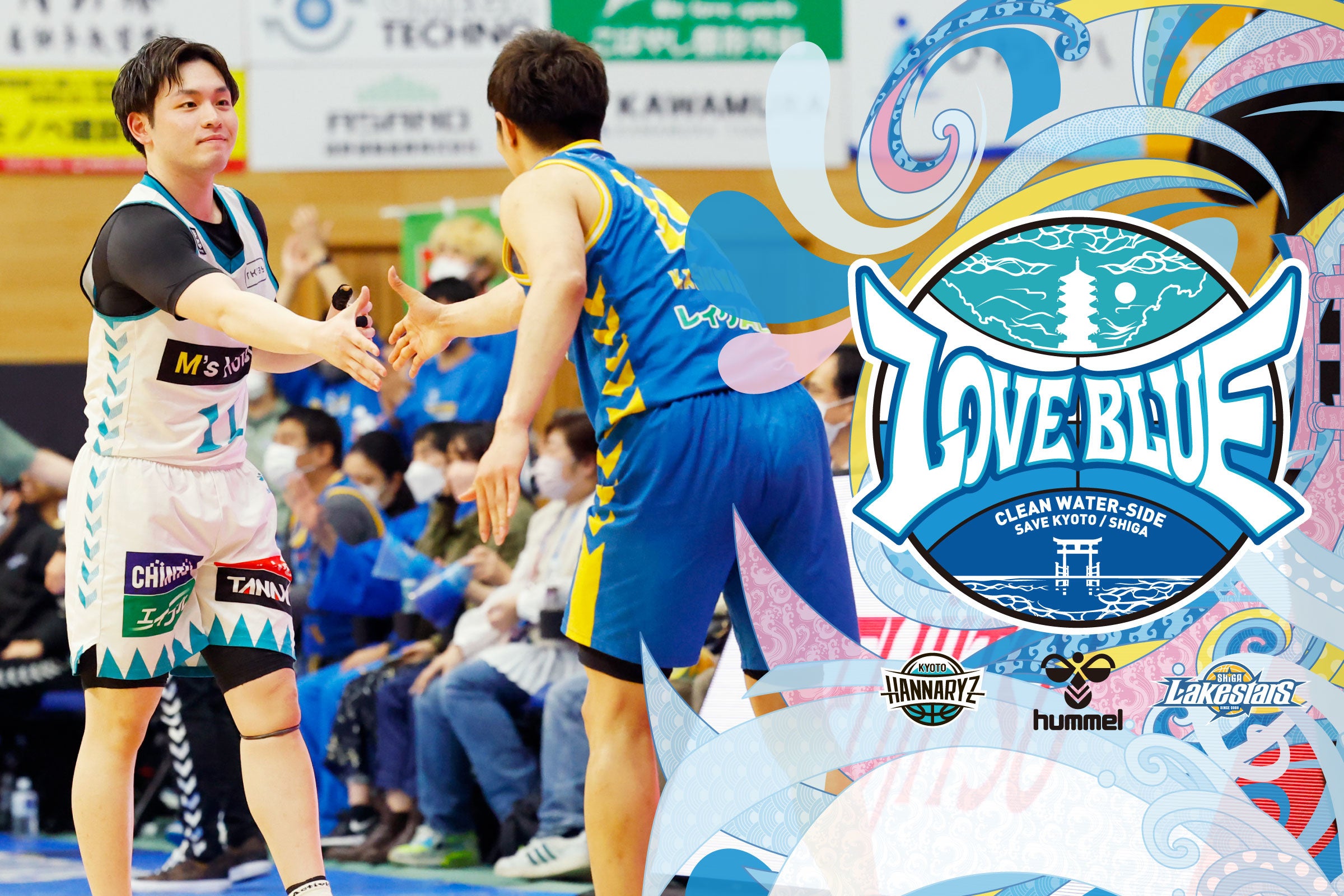 「LOVE BLUE PROJECT」は、京都ハンナリーズと滋賀レイクスターズ、ヒュンメルの3社による環境保全プロジェクト。コートではライバル同士のチームが価値観や文化の違いを認め合い、地域のために行動を共にする取り組みです。