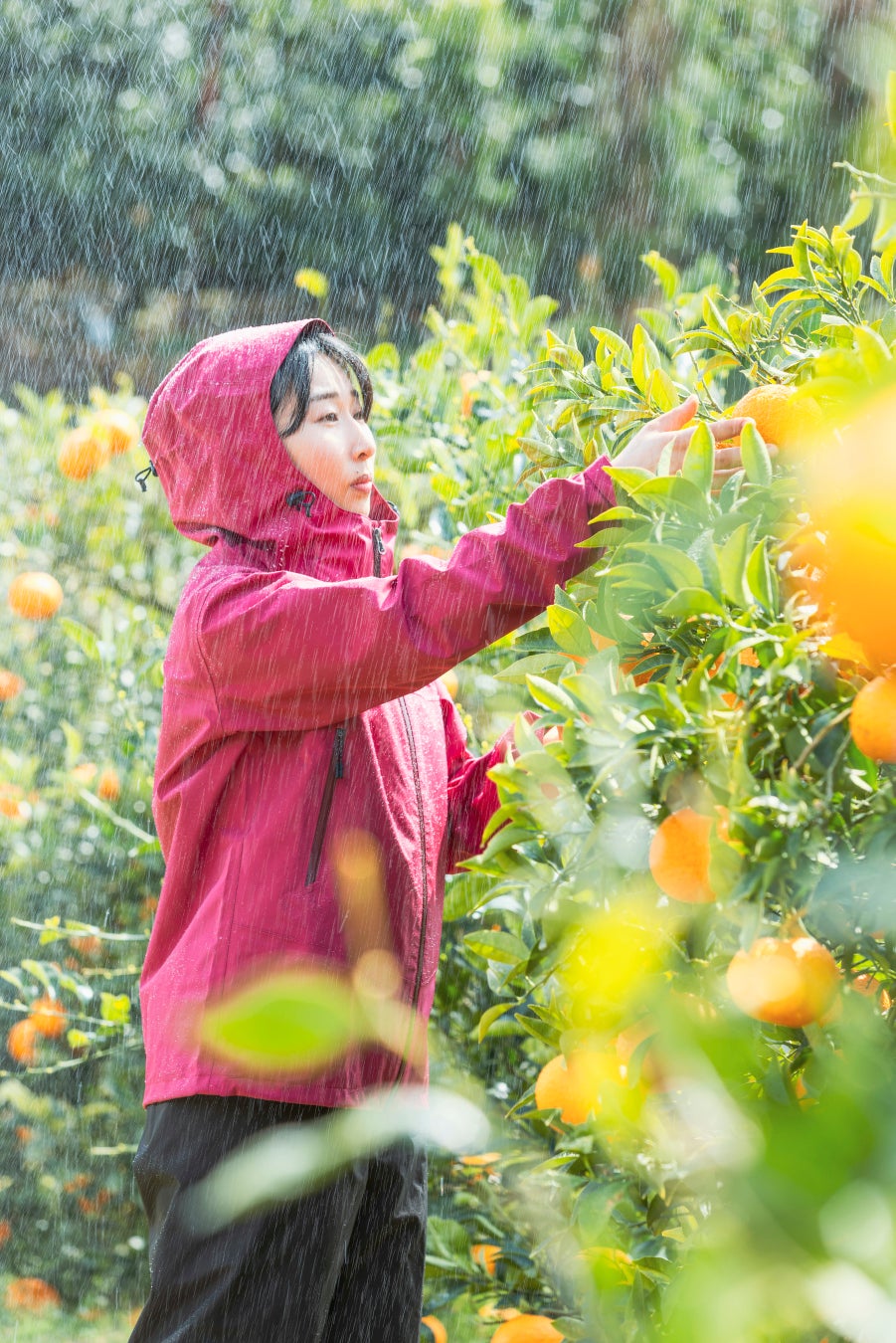 この商品は、農林水産省が手掛ける「農業女子プロジェクト」と共同企画したウエアです。「農業女子プロジェクト」とは、女性農業者が日々の生活の中で培った知恵を、企業の技術やアイデアなどと結びつけ、新たな商品やサービスを創造、発信し、社会全体での女性農業者の存在感を高め、若い女性の職業選択肢に「農業」を加えることを目標としたプロジェクトです。ミズノはこのプロジェクトを通じて果樹農家を中心にヒアリング調査を実施しました。農業女子の皆さんの声に耳を傾ける中で、動きやすい設計や、悪天候にも対応する防水性、透湿性だけでなく、デザイン性にもこだわったミズノ初となる農作業におすすめのレインウエアが完成しました。