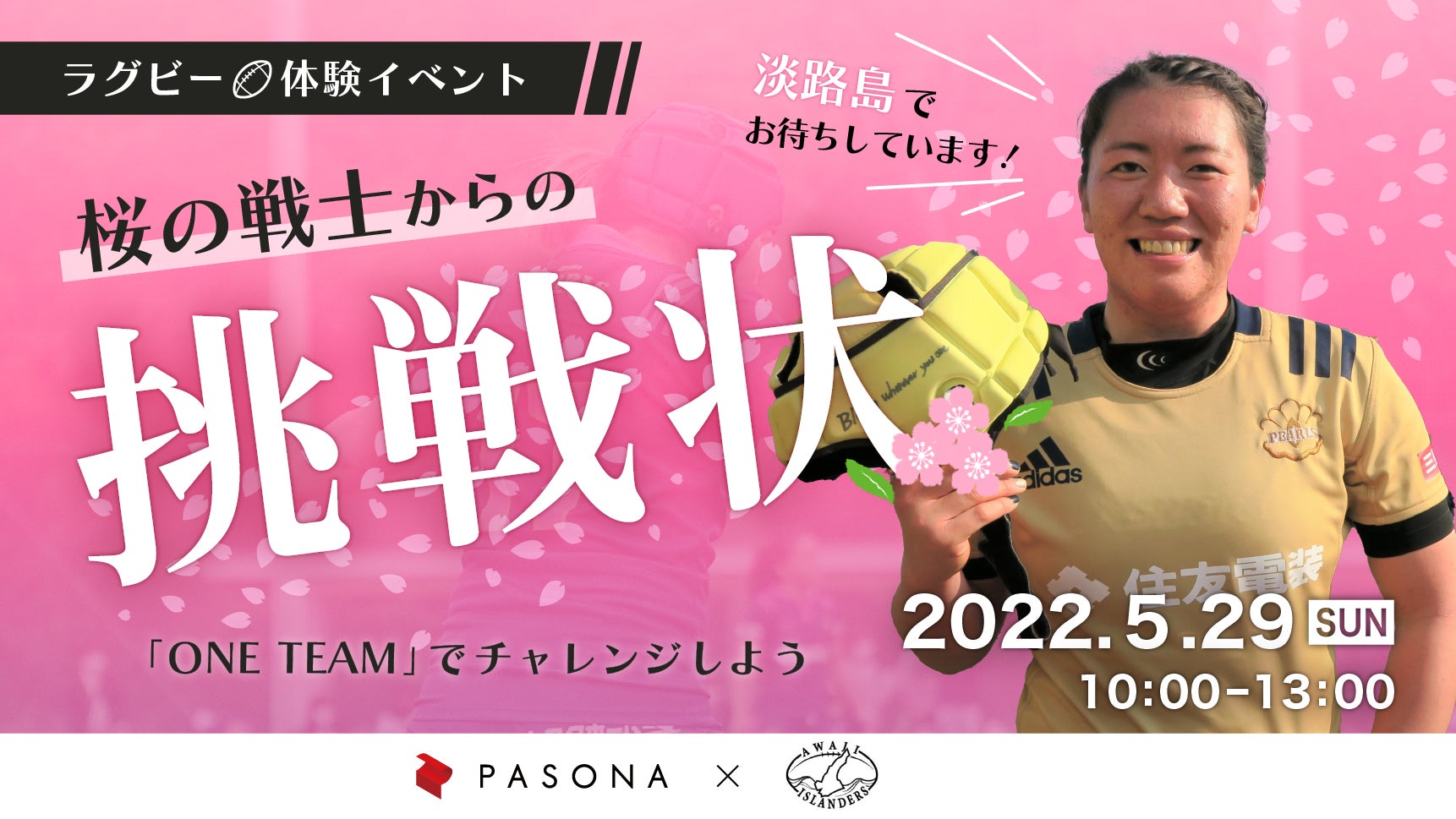 株式会社パソナグループ(本社:東京都千代田区、代表取締役グループ代表 南部靖之)は、淡路島のラグビーチーム「淡路アイランダーズ」と連携し、パソナグループ アスリート社員 玉井希絵をはじめ、女子ラグビー日本代表候補選手と共に行うラグビー体験イベント『桜の戦士からの挑戦状』を兵庫県立淡路島公園(兵庫県淡路市)にて5月29日(日)に開催いたします。